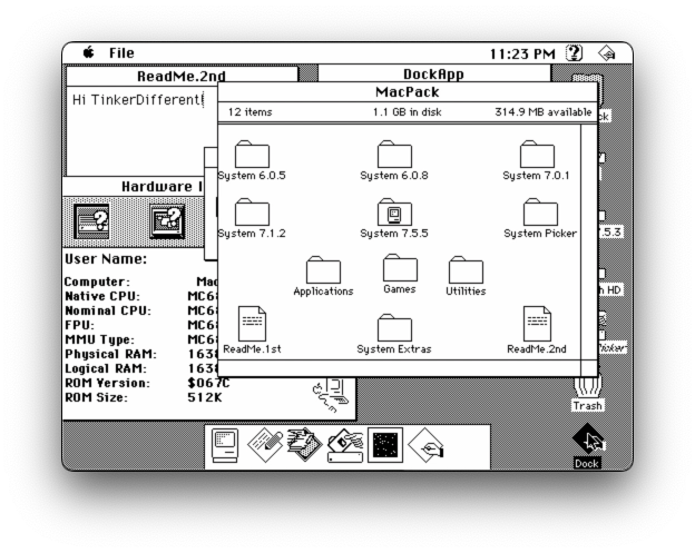 On tinkerdifferent.com, the author revealed his inspiration – "Ok - I've been through the first 5 chapters of the "Macintosh C Programming Primer" diligently typing in all the sample programs along the way and tinkering with them. But to really practice I have to write my OWN program... now wtf do I try and make? After seeing fun reddit post on r/vintageApple where someone posted a mock up of what the Dock might look like in the old System software, I thought that'd be it."